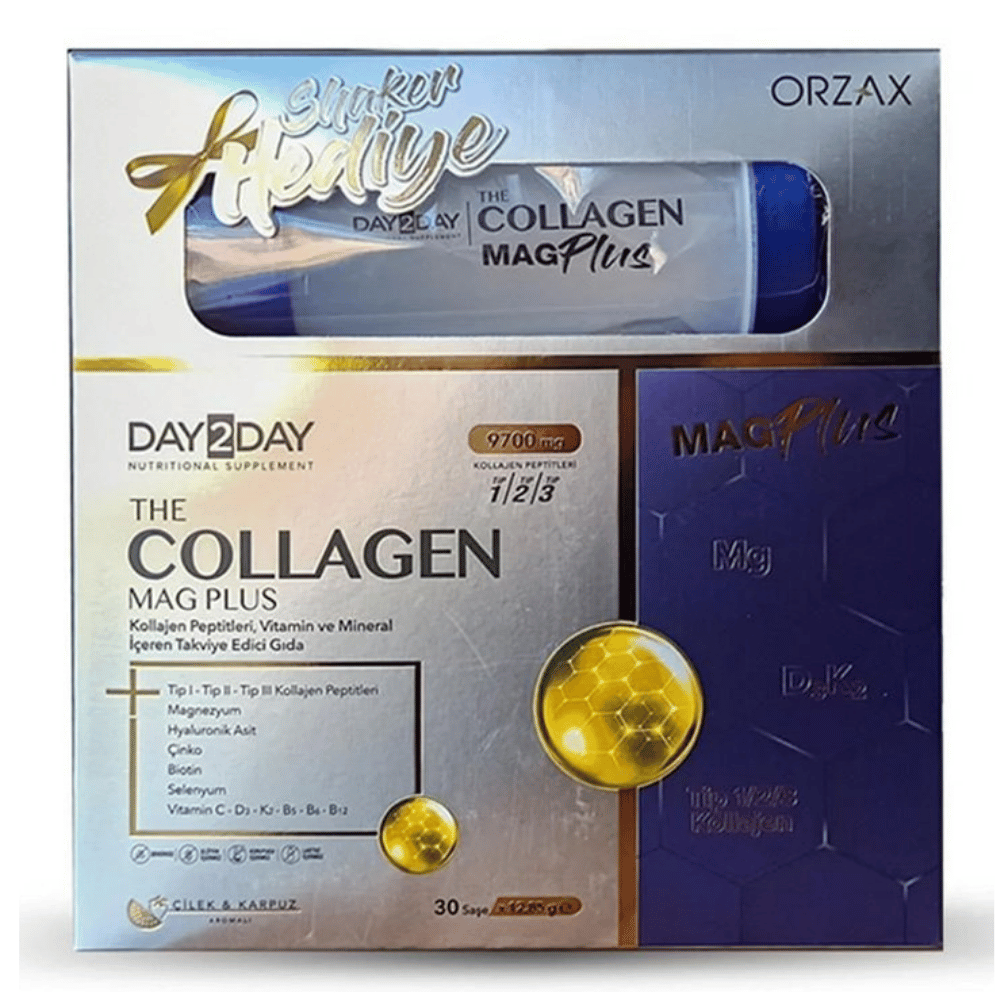 Genel Tanıtım: Güzellik ve zindelik rutininizi tek bir lezzetli içecekle tamamlayın! Day2Day The Collagen Mag Plus, vücudunuzun hem içten hem de dıştan ihtiyaç duyduğu temel yapı taşlarını sunan kapsamlı bir formüldür. Cilt, saç ve tırnak sağlığı için temel olan Tip 1 ve Tip 3 kolajeni, eklem ve kıkırdak sağlığını destekleyen Tip 2 kolajen ile birleştirir. Formül, kas ve enerji fonksiyonları için magnezyum ile zenginleştirilmiştir. Lezzetli çilek ve karpuz aroması ve hediye shaker'ı ile günlük takviye alımınızı keyifli bir ritüele dönüştürür.