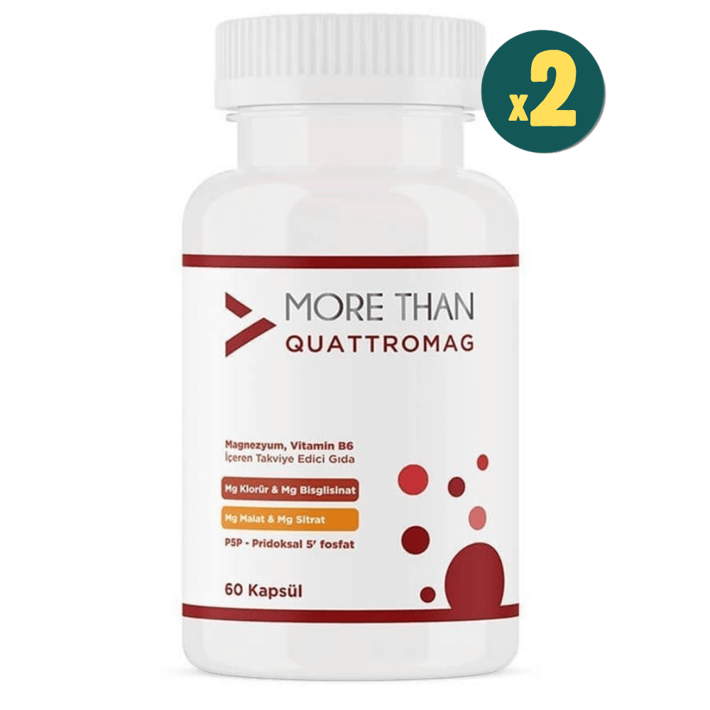 More Than Quattromag, vücudun magnezyum ihtiyacını en verimli şekilde karşılamak üzere tasarlanmış, biyoyararlanımı yüksek dört farklı magnezyum formu ile B6 vitamininin aktif formu olan P5P’yi tek bir formülde birleştirir. Yorgunluğun azaltılmasına, normal kas ve enerji fonksiyonlarına destek olur.